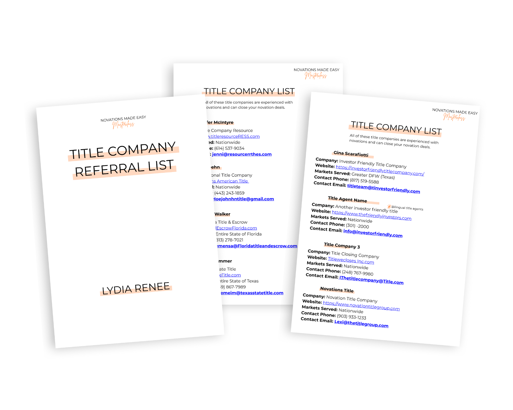 A vetted contact list of experienced, investor friendly title companies that can close your novation deals with ease.